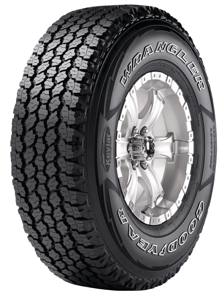 - Versatile Goodyear Wrangler All-Terrain Adventure offers off-road traction in wet, muddy conditions as a result of its open tread pattern