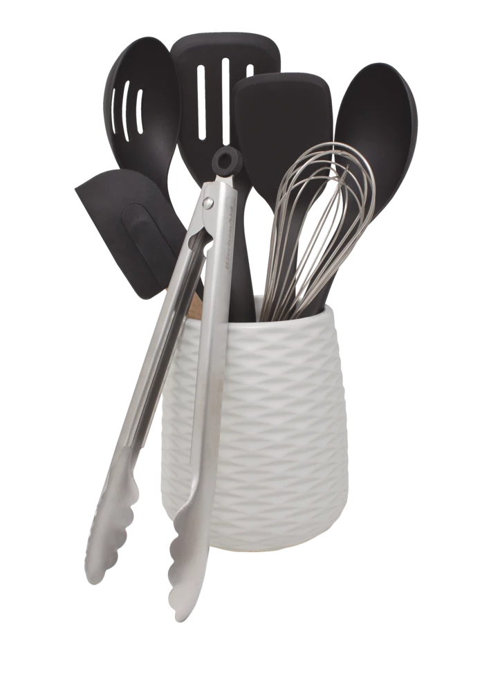 - Set includes: (1) slotted turner, (1) slotted spoon, (1) basting spoon, (1) solid turner, (1) utility whisk, (1) stainless steel utility tongs, (1) spatula and (1) ceramic crock