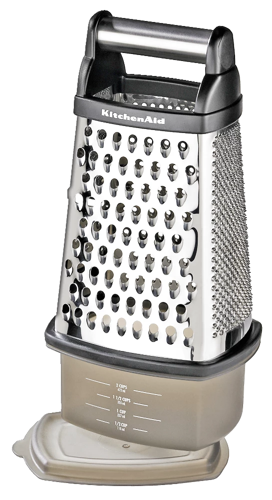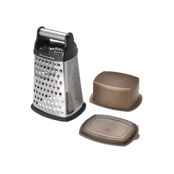 - A superbly crafted box grater from KitchenAid featuring a covered container attached to the bottom to catch food while grating or slicing